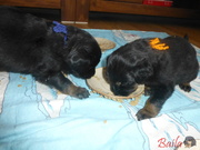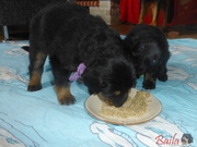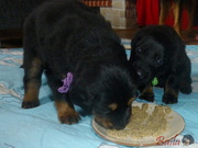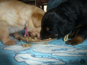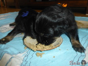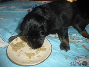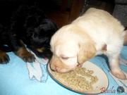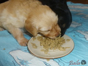 Dnes ráno dostala štěňátka poprvé na talířky namočené granulky s piškotem. Všechna se do nové bašty pustila s velikánskou chutí.