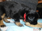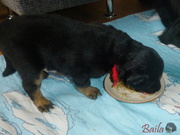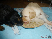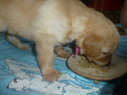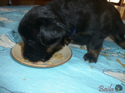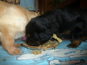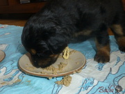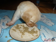 Vrh ADnes ráno dostala štěňátka poprvé na talířky namočené granulky s piškotem. Všechna se do nové bašty pustila s velikánskou chutí.